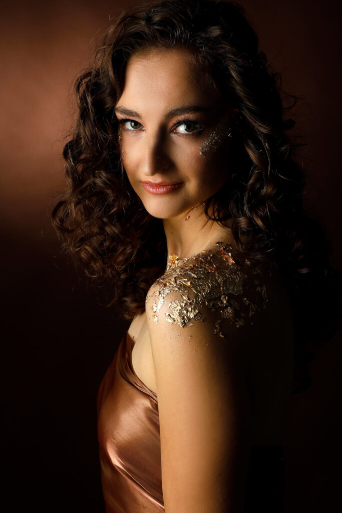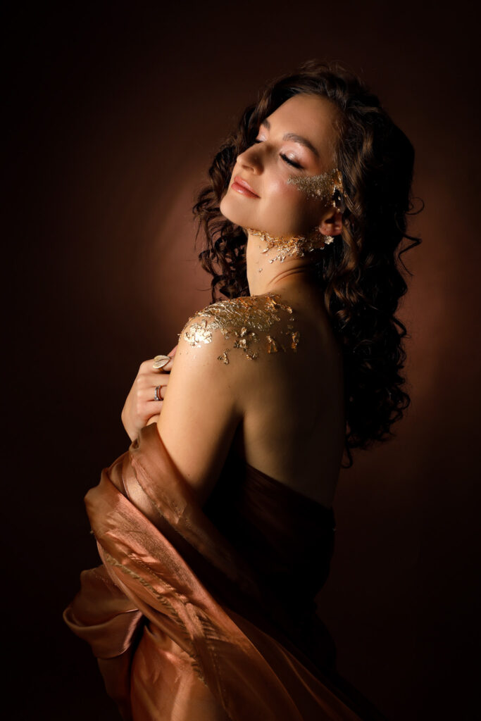 Mě osobně velmi zaujalo plátkové zlato, jako kreativní prvek při líčení, který dodá neopakovatelnou atmosféru. Proces kreativity začal už při samotném líčení a přípravě na focení, což je nedílná součást celého procesu.